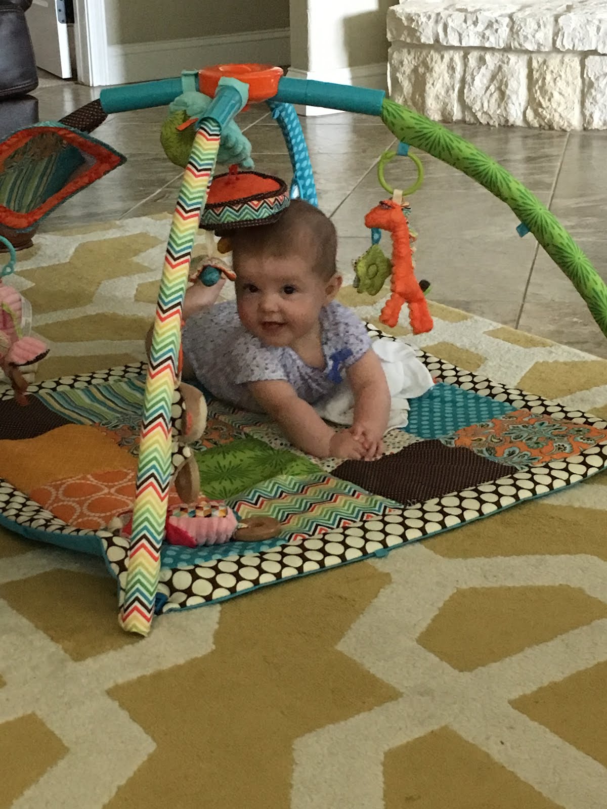 And night sleep....I had a 5 hour stretch of sleep once. That was fabulous! But the rest of the time she's waking/eating about every 3-4 hours during the night. She got where she was consistently waking up 2 hours after she went down...every single night. Chris would try to soothe her, bounce her, rock her but usually I had to go in and feed her. That has tapered off a little and she'll go longer than 2 hours for the first wake up. I definitely thought by 6 months I would be sleeping more. I have to remember that this isn't forever and I'll sleep again eventually! (Right!?!)